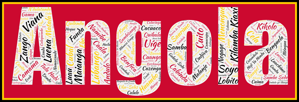 Toutes les villes de l’Angola en un seul coup d’œil présentes dans l’Affiche Angola – v2, ce pays de 1.246 000 km² et de 39 millions d’habitants. 558 communes (Munipality) dans ce cadre ! Vous retrouverez facilement Luanda, Viana, Cacuaco, Belas ou Cazenga mais sont présentes également Bolongongo, Quitexe, Maquela do Zombo . Plusieurs versions sont disponibles avec les couleurs originelles du drapeau des Palancas Negras ! Nous accolons à titre indicatif le drapeau pour que vous puissiez comprendre l’utilisation des couleurs.
