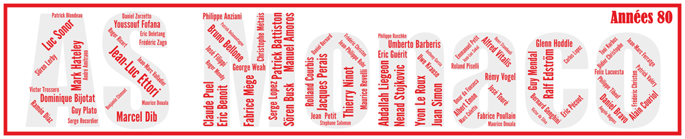 Sous vos yeux, tous les joueurs intégrés au club de la principauté monégasque de 1980 à 1990. Retrouvez les 104 joueurs qui ont jalonné cette décennie, entrainés par Gérard Banide, Lucien Müller, et Arsène Wenger. Voici les 10 premiers joueurs utilisés de la décennie: Ettori, Puel, Amoros, Bijotat, Bellone, Sonor, Dib, Bravo, Fofana e Liegeon. Nous accolons le sigle du club ou le maillot pour l’information des couleurs utilisées dans l’Affiche AS Monaco – Années 80 – v1.