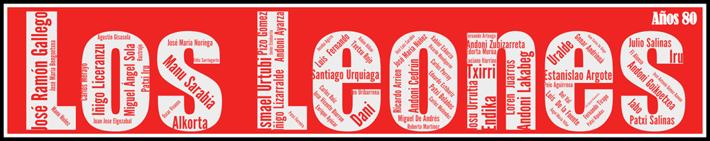 Sous vos yeux, tous les joueurs intégrés au club phare de Bilbao. Retrouvez les 70 joueurs qui ont jalonné cette décennie, entrainés par Iñaki Sáez, Javier Clemente, Iríbar, Howard Kendall et Rojo. Voici les 10 premiers joueurs utilisés de la décennie: Gallego, Argote, Sarabia, Urquiaga, Goikoetxea, Zubizarreta, Urtubi, De Andrés, Liceranzu et Noriega. Nous accolons le sigle du club ou le maillot pour l’information des couleurs utilisées dans l’Affiche Athletic Club – Los Leones -Années 80 – v1.