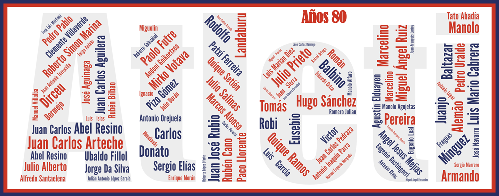 Sous vos yeux, tous les joueurs intégrés au club des matelassiers. Retrouvez les 98 joueurs qui ont jalonné cette décennie, entrainés successivement par García Traid (80-81 et 81-82), Carriega, Luis Aragonés (82-86 et 87), Miera, César Luis Menotti et José Ufarte. Voici les 10 premiers joueurs utilisés de la décennie: Arteche, Tomás , Marina, Ramos, Ruiz, Prieto, Rubio, Sánchez, Mejias et Votava. Nous accolons le sigle du club ou le maillot pour l’information des couleurs utilisées dans l’Affiche Atlético Madrid – Atleti – Années 80 – v3.
