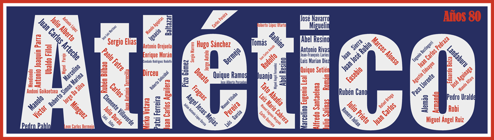 Sous vos yeux, tous les joueurs intégrés au club des matelassiers. Retrouvez les 98 joueurs qui ont jalonné cette décennie, entrainés successivement par García Traid (80-81 et 81-82), Carriega, Luis Aragonés (82-86 et 87), Miera, César Luis Menotti et José Ufarte. Voici les 10 premiers joueurs utilisés de la décennie: Arteche, Tomás , Marina, Ramos, Ruiz, Prieto, Rubio, Sánchez, Mejias et Votava. Nous accolons le sigle du club ou le maillot pour l’information des couleurs utilisées dans l’Affiche Atlético Madrid – Atlético – Années 80 – v2.