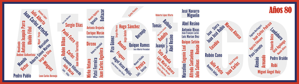 Sous vos yeux, tous les joueurs intégrés au club des matelassiers. Retrouvez les 98 joueurs qui ont jalonné cette décennie, entrainés successivement par García Traid (80-81 et 81-82), Carriega, Luis Aragonés (82-86 et 87), Miera, César Luis Menotti et José Ufarte. Voici les 10 premiers joueurs utilisés de la décennie: Arteche, Tomás , Marina, Ramos, Ruiz, Prieto, Rubio, Sánchez, Mejias et Votava. Nous accolons le sigle du club ou le maillot pour l’information des couleurs utilisées dans l’Affiche Atlético Madrid – Atlético – Années 80 – v3.