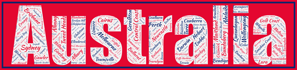 Toutes les villes de l’Australie en un seul coup d’œil présentes dans l’Affiche Australie – Australia – v2. 613 communes (Localities) se répartissent dans cette affiche !