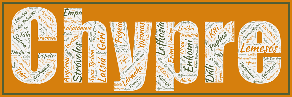 Vous retrouverez facilement Lemesós, Stróvolos, Lefkosía ou Lárnaka mais sont présentes également Lythrodóntas, Palaichóri Mórfou, Ágios Geórgios. Plusieurs versions sont disponibles avec les couleurs originelles du drapeau de l’île de l’Amour.