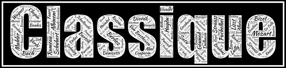 Vous retrouverez par exemple facilement Mozart, Bach Beethoven. Sont présents également Berlioz, Vivaldi, Chopin mais aussi Schönberg , Boulez, Buxtehude. 330 noms se répartissent dans le mot classique. Nous avons choisi une police d’écriture douce, le Kaushan Script ainsi qu’un classique noir pour rappeler les partitions de musiques et l’écriture des notes. Les amoureux de musique classique seront de toute évidence comblés avec l’Affiche Compositeurs – Classique – v1.