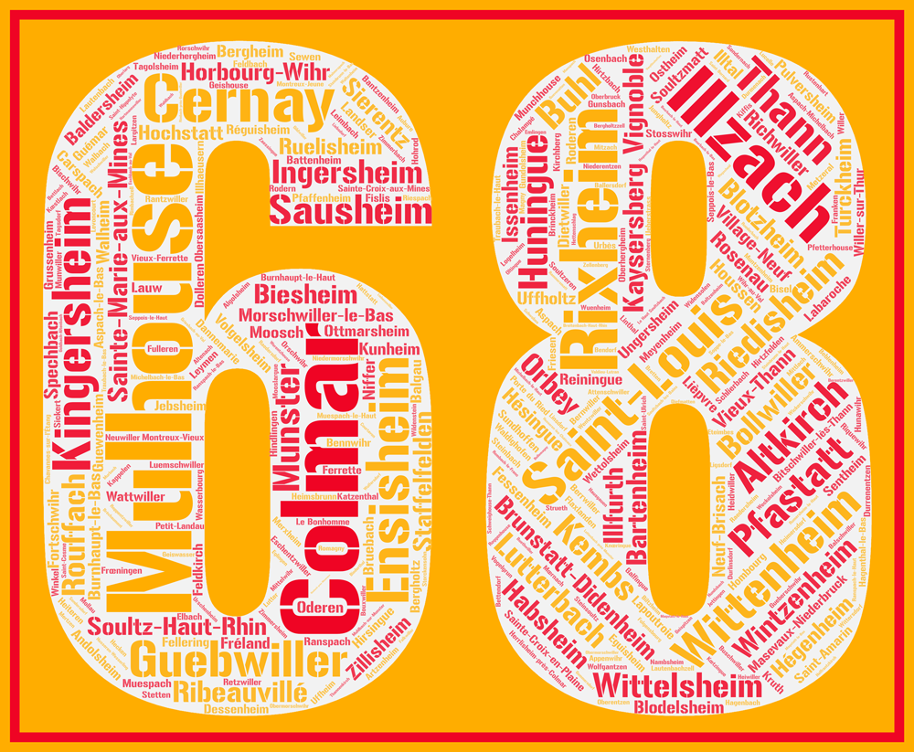 Affichez vos racines avec toutes les communes du département du Haut-Rhin aux couleurs locales avec l’Affiche département Haut-Rhin – 68 – v1 !