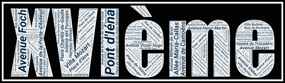 Vous retrouverez facilement le Pont d’Iéna, l’Avenue Victor-Hugo, le square du Trocadéro. Mais saurez vous retrouver: la rue Foucault, l’avenue de Malakoff, la Rue Charles-Dickens . Les 577 voies (rues, boulevards, avenues, places, impasses,…) sont réparties dans l’arrondissement.