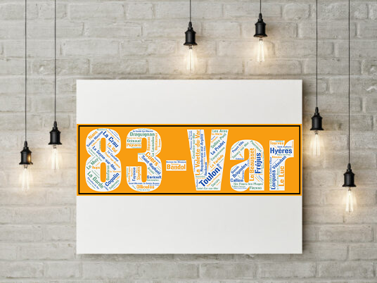 Nous apposons par ailleurs sous la création, le logo du département pour comprendre l’utilisation des couleurs (Couleurs RGB à l’identique) ainsi qu’une mise en situation de l’Affiche département Var +83 – v1 . Chaque département possède ses différentes versions : son numéro, son nom, son numéro + son nom, son ou ses gentilés. Pour faciliter la recherche, les affiches sont classées par régions administratives mais encore par département.