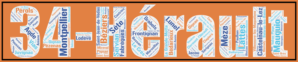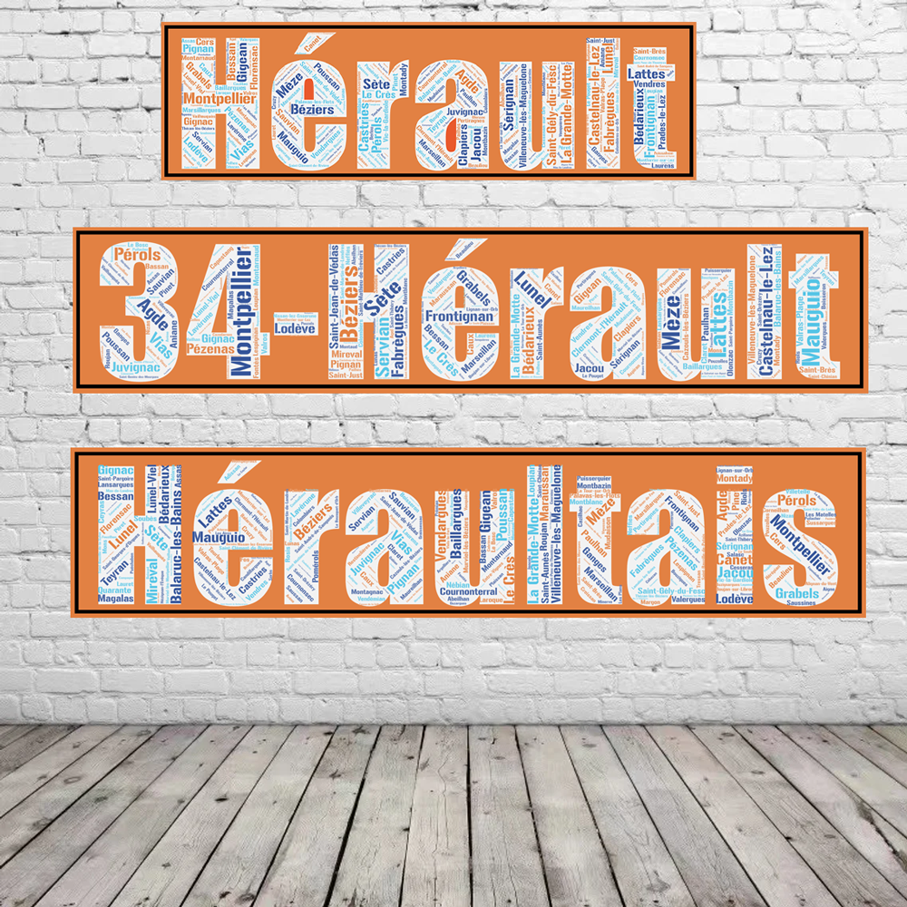 Découvrez toutes les communes du département de l’Hérault aux couleurs originales avec l’Affiche du département de l’Hérault +34 – v3!
