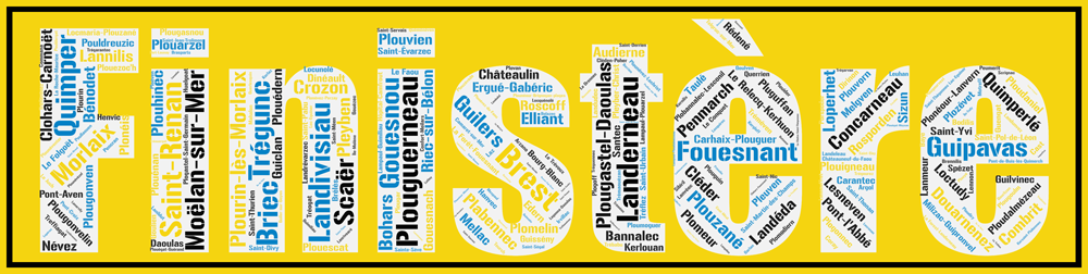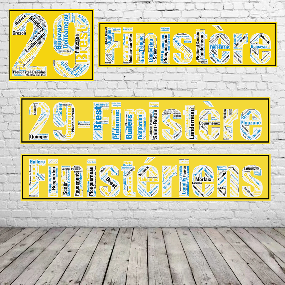 Vous retrouverez facilement Brest, Quimper, Concarneau ou Landerneau. Mais saurez vous retrouver ? :Guilvinec, Huelgoat, l’Ile de Sein. Les 277 communes sont réparties dans le nom du département. Objet unique qui ravira les passionnés du Finistère, votre regard sur l’affiche sera toujours différent et vous découvrirez sans cesse de nouveaux noms.