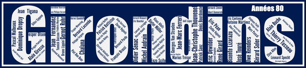 Sous vos yeux, tous les joueurs intégrés au club des Girondins de Bordeaux de 1980 à 1990. Retrouvez les 83 joueurs qui ont jalonné cette décennie, entrainés par Raymond Goethals (1980 et 89-90), Aimé Jacquet et Didier Couécou. Voici les 10 premiers joueurs utilisés de la décennie: Thouvenel, Tigana, Rohr, Lacombe, Girard, Giresse, Dropsy, Battiston, Spechtn Ferreri. Nous accolons le sigle du club ou le maillot pour l’information des couleurs utilisées dans l’Affiche Girondins de Bordeaux – Années 80 – v2.