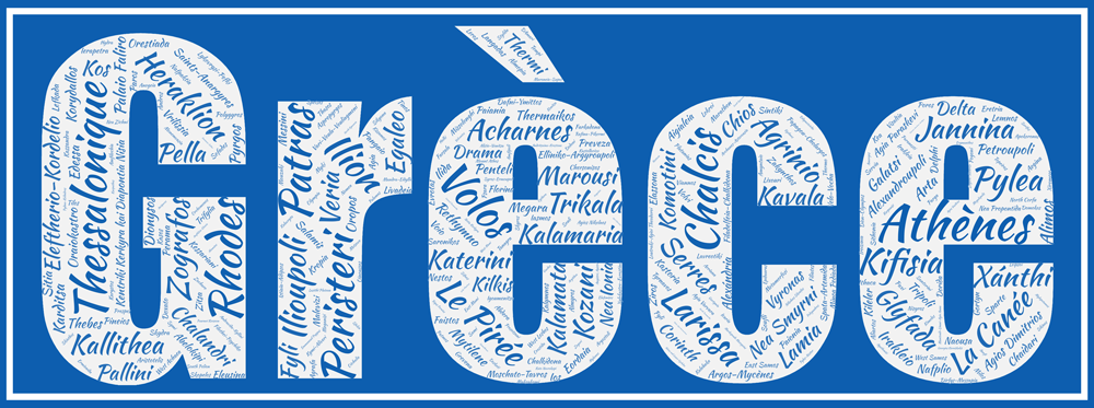 Vous retrouverez facilement Athènes, Thessalonique, Patras ou Heraklion mais sont présentes également Polygyros, Aktio-Vonitsa, Olympia. Plusieurs versions sont disponibles avec les couleurs originelles du drapeau du pays des Hellènes. Nous accolons à titre indicatif le drapeau pour que vous puissiez comprendre l’utilisation des couleurs.