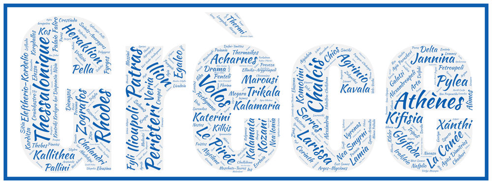 Vous retrouverez facilement Athènes, Thessalonique, Patras ou Héraklion mais sont présentes également Polygyros, Aktio-Vonitsa, Olympia. Plusieurs versions sont disponibles avec les couleurs originelles du drapeau du pays des Hellènes. Nous accolons à titre indicatif le drapeau pour que vous puissiez comprendre l’utilisation des couleurs.