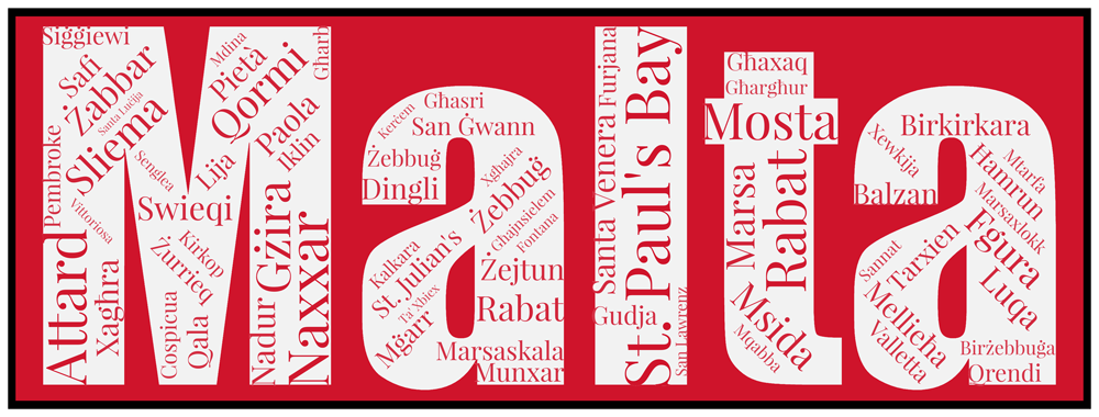 Toutes les villes de Malte en un seul coup d’œil présentes dans l’Affiche Malte – Malta – v1. 68 communes dans ce cadre !