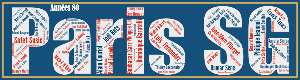 Sous vos yeux, tous les joueurs intégrés au club phare de la Capitale. Retrouvez les 93 joueurs qui ont jalonné cette décennie, entrainés par Georges Peyroche, Christian Coste, Gérard Houiller (85-87 et 88), Eric Mombaerts et Tomislav Ivić. Voici les 10 premiers joueurs utilisés de la décennie: Susic, Pilorget, Rocheteau, Fernandez, Tanasi, Bats, Lemoult, Baratelli, Bathenay et Jeannol. Nous accolons le sigle du club ou le maillot pour l’information des couleurs utilisées dans l’Affiche Paris Saint-Germain – Paris SG – Années 80 – v1 .