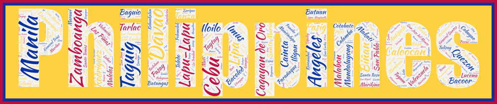 Toutes les villes des Philippines ( de plus de 40 000 habitants) en un seul coup d’œil présentes dans l’Affiche Philippines – v3. 738 communes (municipality) dans cette affiche ! Vous retrouverez facilement Manila, Quezon City, mais sont présentes également Cebu, Davao, Tagaytay.