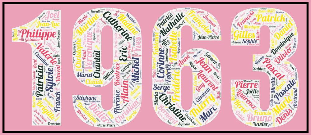 Redécouvrez tous les prénoms les plus donnés de cette génération 1963 dans l’affiche prénoms année 1963 et vous remonterez le temps! Les 500 prénoms (504 exactement !) les plus donnés figurent dans l’affiche pour l’année travaillée!!! issus des data de l’INSEE. Ils représentent 94.97 % des naissances recensées cette année-là.