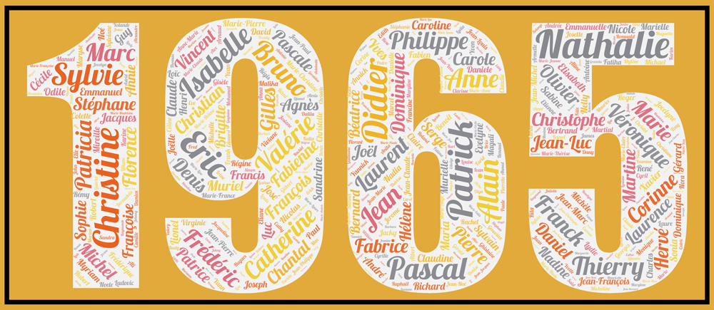 Redécouvrez tous les prénoms les plus donnés de cette génération 1965 dans l’affiche prénoms année 1965 et vous remonterez le temps! Les 500 prénoms (506 exactement !) les plus donnés figurent dans l’affiche pour l’année travaillée!!! issus des data de l’INSEE. Ils représentent 94.79 % des naissances recensées cette année-là.