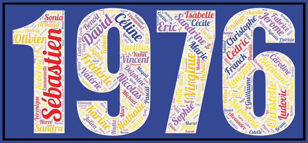 Redécouvrez tous les prénoms les plus donnés de cette génération 1976 dans l’affiche prénoms année 1976-v1 et vous remonterez le temps! Les 500 prénoms les plus donnés (512 exactement !) figurent dans l’affiche pour l’année travaillée!!! issus des data de l’INSEE. Ils représentent 90,18 % des naissances recensées cette année-là.