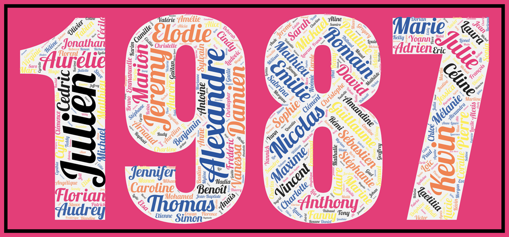 Redécouvrez tous les prénoms les plus donnés de cette génération 1987 dans l’affiche prénoms année 1987 et vous remonterez le temps! Les 500 prénoms les plus donnés (507 exactement !) figurent dans l’affiche pour l’année travaillée!!! issus des data de l’INSEE. Ils représentent 86,86 % des naissances recensées cette année-là.