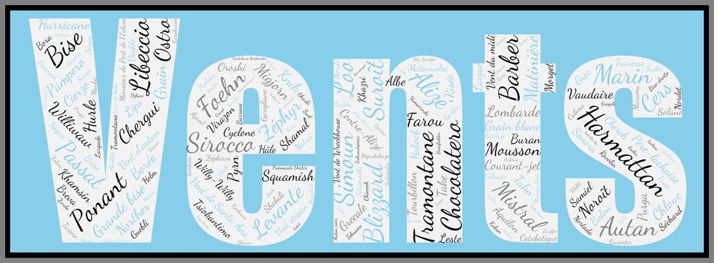 L’intégralité des vents de toute la planète dans l’Affiche Vents – v2 : l’harmattan, le ponant le zéphyr, mais aussi le mistral, Vent de Wreckhouse, Mezzar-ifoulousen, le Kona. 190 noms de vents sont présents dans l’Affiche Vents – v2 ; Ils seront désormais devant vos yeux en permanence.